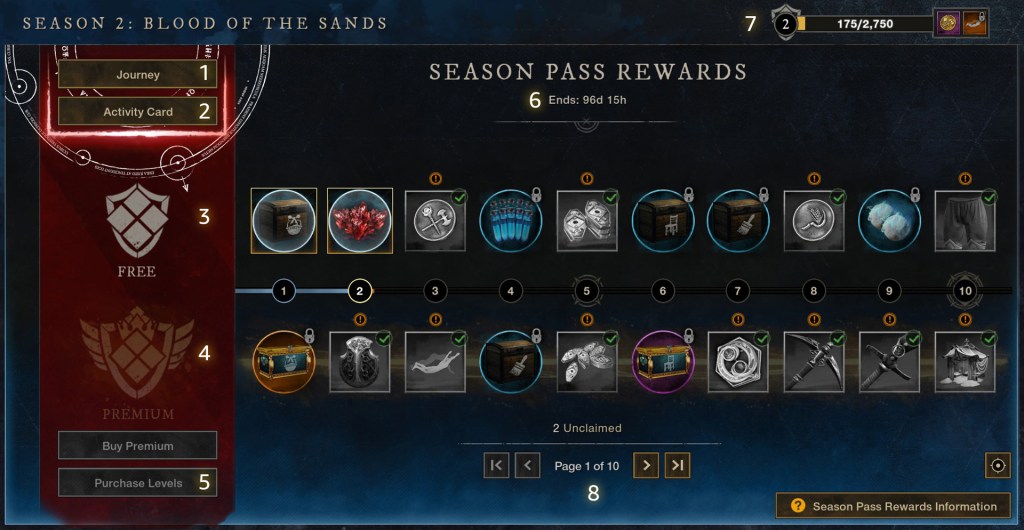 An example of a reward track in the game “New World”. Players can complete tasks to get experience and advance. Each level reached gives a one-time prize. Players have the option to purchase a season pass, which unlocks access to the rewards in the bottom row (players must still progress their track to claim them).